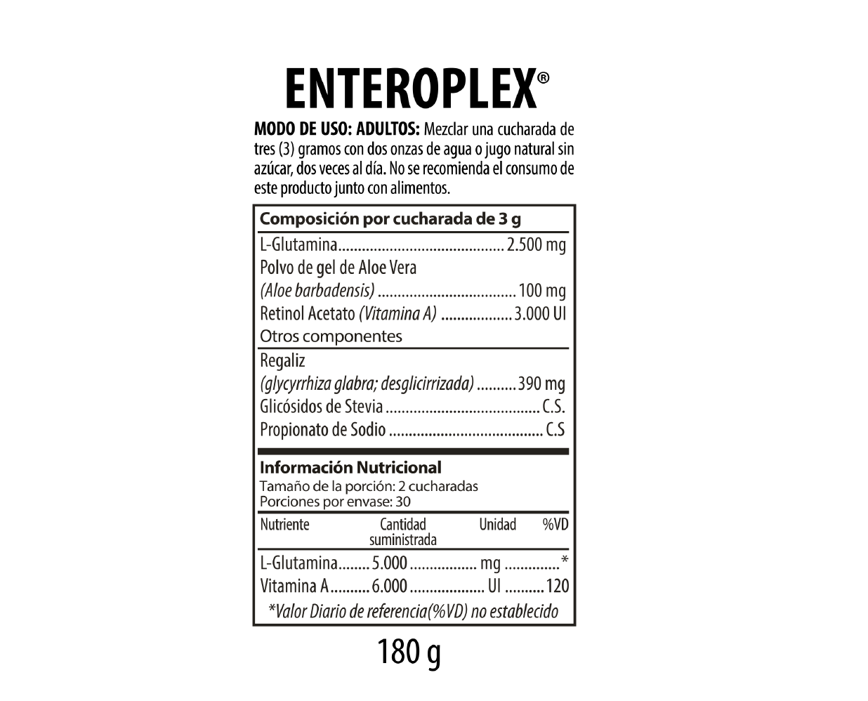 Frasco por 180 gramos de polvo para reconstituir con cuchara dispensadora(espacio)de 3 gramos, compuesta de L-Glutamina (USP), Polvo liofilizado de gel de hojas de Aloe Vera estandarizado con un mínimo de 30% de mananos acetilados poliméricos sin efectos laxantes, Raíz de Regaliz desglicirrizado y Vitamina A, todos en formas altamente biodisponibles, lo que juega un rol clave en la funcionalidad del producto.