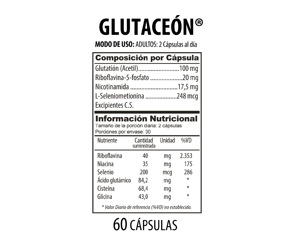 Fórmula a base de S-Acetil-Glutatión reducido, Riboflavina–5-fosfato, Nicotinamida y Selenio. Glutaceón® es una fórmula compuesta del tripéptido glutatión reducido en su forma patentada, S-Acetil-Glutatión. Es adicionada de la forma activa de la Vitamina B2, Riboflavina–5-fosfato, Nicotinamida y Selenio. Todos los compuestos se encuentran en formas altamente biodisponibles,  lo que juega un rol clave en la funcionalidad del producto.